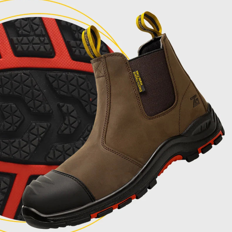 Ce modèle en cuir de vache suédé, avec embout acier et slip-on facile à enfiler, combine protection, style et confort professionnel.